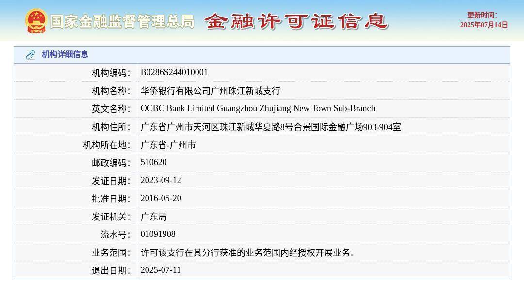 7月14日,根据国家金融监管总局金融许可证信息,华侨银行有限公司广州珠江新城支行获准退出,退出日期2025年7月11日。